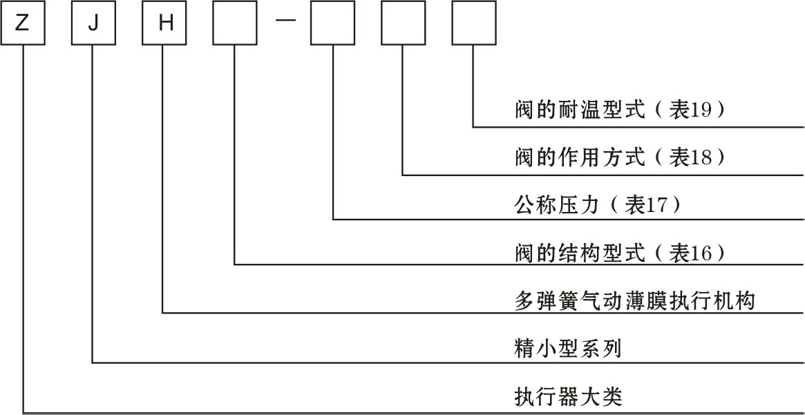 本產(chǎn)品型號(hào)由兩小節(jié)組成,節(jié)包括四位代號(hào),表示本產(chǎn)品大類(lèi)及組成的執(zhí)行機(jī)構(gòu)和閥的
