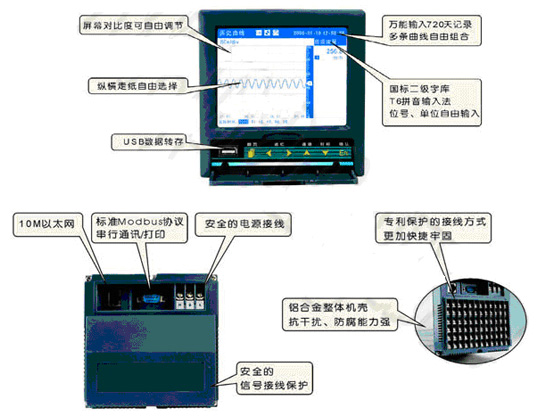 藍(lán)屏無紙記錄儀,可輸入標(biāo)準(zhǔn)電流、標(biāo)準(zhǔn)電壓、頻率、毫伏、熱電偶、熱電阻等信號。具有傳感器隔離配電輸出、繼電器報警輸出、變送輸出、流量積算、溫壓補(bǔ)償、歷史數(shù)據(jù)轉(zhuǎn)存、打印以及遠(yuǎn)程通訊功能。